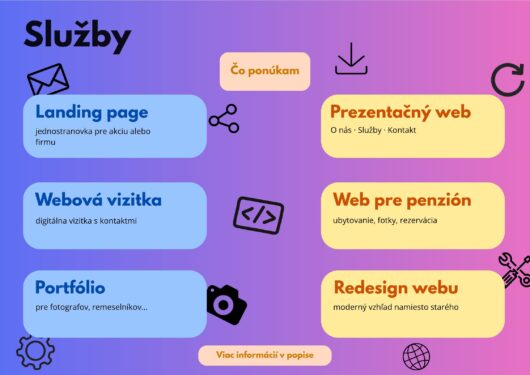 Tvorím webové stránky na mieru pre malé firmy, živnostníkov, penzióny, fotografov a každého, kto chce byť viditeľný online. Každý web je unikátny – nie šablóna stiahnutá z internetu, ale niečo vytvorené priamo pre vás a váš biznis.